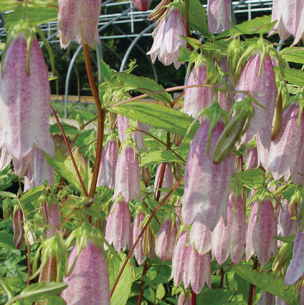 More: This is a strong grower that does not want wet feet. The flowers are enjoyed by bumblebees in particular. The parentage of this hybrid is not settled. Perhaps a cross between C. takesimana and the closely related C. punctata. However, it looks a lot like the species C. takesimana. Self-seeding may be a problem, I will keep you posted. Other campanulas make a good cut flower. I am going to see if this one does as well.