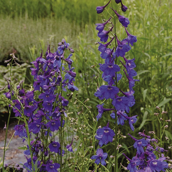 More: Although the blooming stem can reach four feet, this delphinium does not usually require staking. The flowers are held more loosely and in an open way on their stems, which means an airier feel and a lighter weight. Beautiful in the vase and stands out well intermingled with grasses for a meadow-y feel or massed in a more formal border. May get a second bloom if cut back hard after first flowering period and fed with fish emulsion. Crowns are prone to rotting out, so plant slightly proud of the soil line and mulch up to, but not over, the crown. All delphiniums contain chemical compounds toxic to humans and livestock.