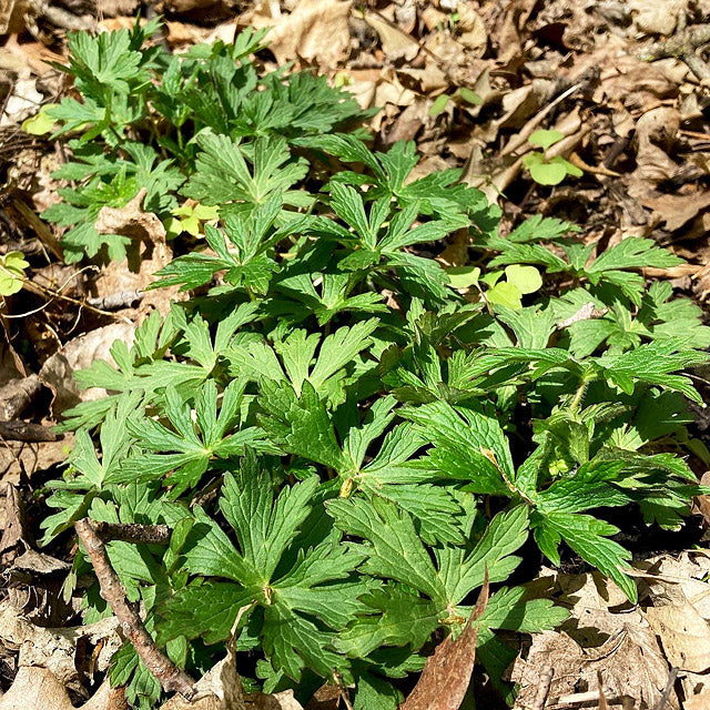 More: Has attractive leaves and an interesting seedhead. The seeds are enjoyed by Mourning Doves and Quail. The flowers are an early source of pollen and nectar for bumblebees and solitary bees as well as butterflies. Andrena distans, one of our wild bee species in Maine, is a specialist on this plant. It is a larval host for Orgyia leucostigma (White-marked Tussock Moth). G. maculatum likes open shade and wants consistent moisture when in full sun. It co-exists happily with Carex species, small ferns, epimediums, woodland asters, and goldenrods as part of a shady matrix. Deer and rabbit resistant. The root has been used medicinally.