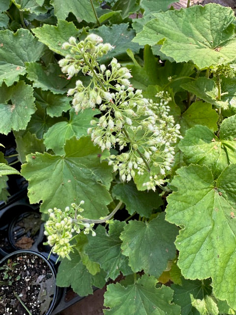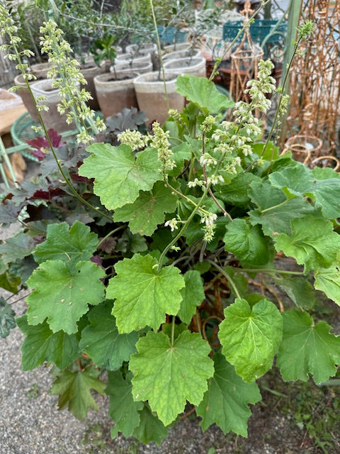 More: This is hands down my favorite Heuchera. It grows much larger than other heucheras and has a substantial panicle of bloom late in the season. The maple-shaped leaves are large and velvety. Although it takes a couple of seasons to establish, 'Autumn Bride' grows well in dry shade and the bloom makes a good cut flower. Both the pale green leaves and the white flowers really brighten up the shady garden. Overall its character is elegant and stately. Salt tolerant and deer and rabbit resistant. Good cut flower.