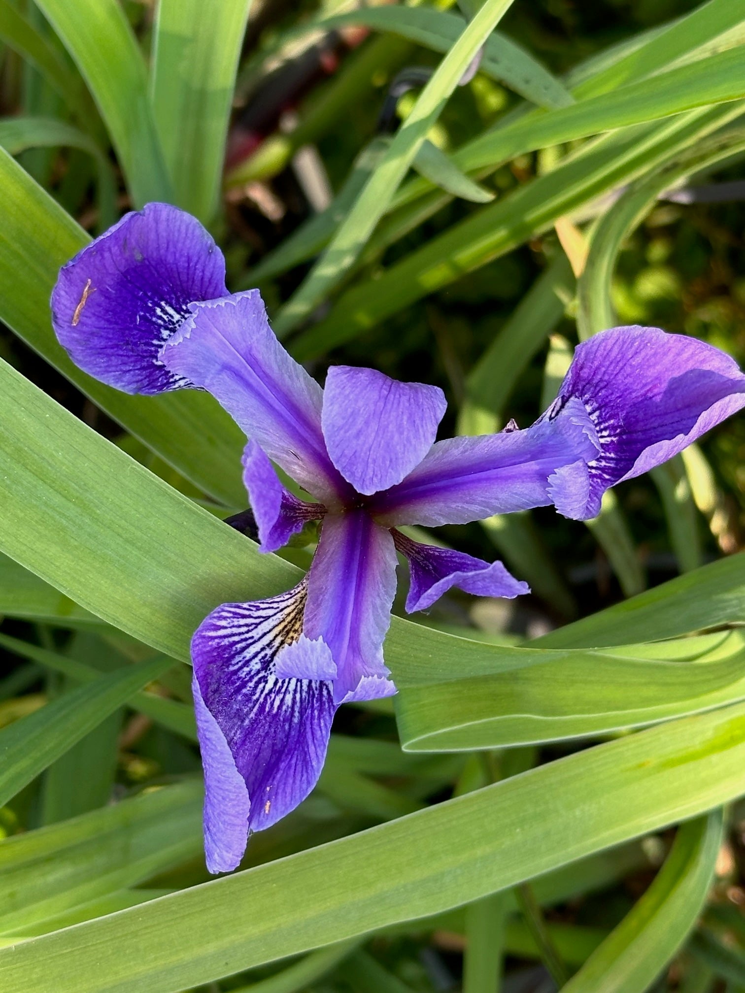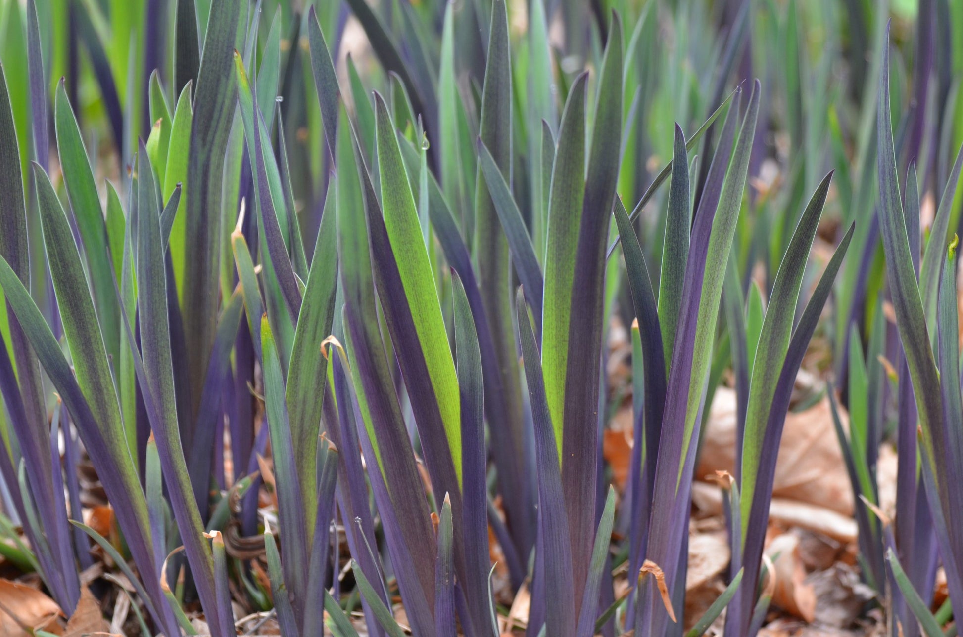 Basics: zones 2-7, 24-36" x 18-24", full sun to light shade, foliage emerges purple and as it elongates and matures turns greener, but streaked with purple at the base, medium violet-blue bloom in early summer, likes consistently moist to wet wet feet and can grow in shallow standing water.
