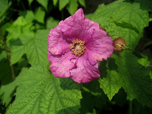More: This is an excellent thornless, suckering shrub for a shady understory, very adaptable and tough, with attractive maple-like foliage and pretty blooms. Deer may do some nibbling. Has been used medicinally. Although the berries are not particularly succulent treats as are blackberries and raspberries, they are edible and have been used fresh, dried, and in sauces.