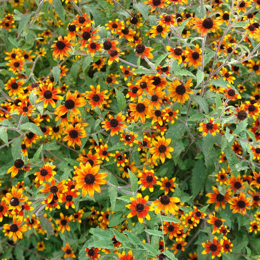 More: This cultivar will definitely self sow, but the resulting plants may or may not exhibit the same traits as 'Prairie Glow', which could be interesting or annoying depending on the type of gardener you are and the style of garden you have. It may also behave as a short-lived perennial. I like this smaller-flowered Rudbeckia planted with other larger, single flowered Rudbeckias and grasses. Its branching structure with numerous flower heads (reaching up to 5' tall) makes for a great bouquet ingredient. Cut as a full spray for larger arrangements. Deer resistant and very attractive to pollinators.